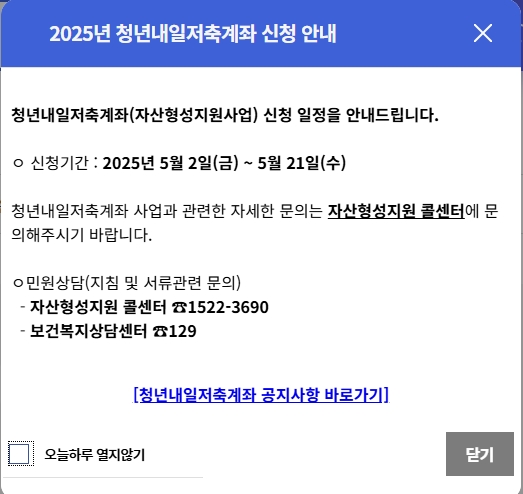 - 청년내일저축계좌 온라인 신청 기간은 5. 2(금) ~ 5. 21(수)